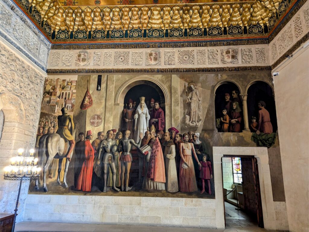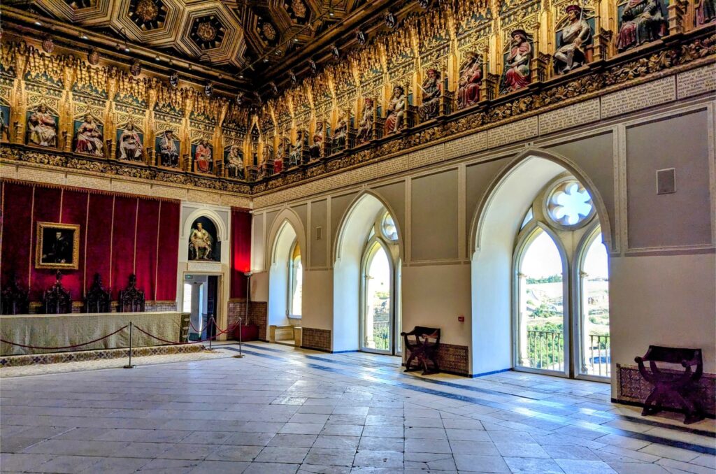 The Alcázar’s architecture reflects its complex history, blending Moorish, Gothic, and Renaissance styles. The fortress stands on a rocky crag overlooking the confluence of the Eresma and Clamores rivers, with impenetrable walls, a deep moat, and impressive towers. The palace’s interior features lavishly decorated rooms, coffered ceilings, and ornate stone carvings.