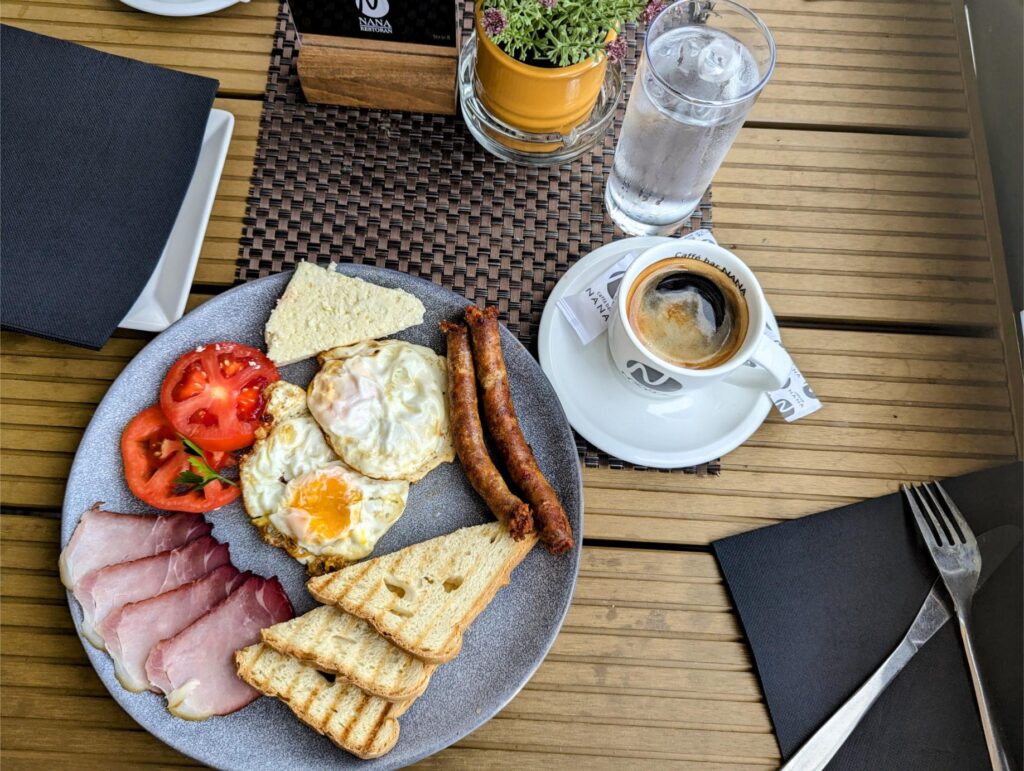 Two Nana Special breakfasts, two cappuccinos, and two cafe americanos, plus tip was 2,000 RSD ($18.78 USD).