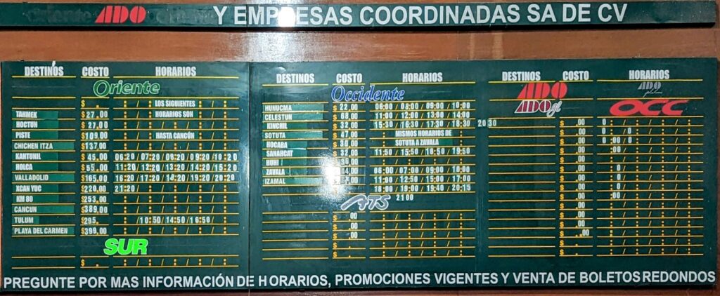 The day before we departed, we visited the station to confirm departure times to Valladolid (part of the Merida to Cancun route), which were prominently displayed on one of the bus station signs above the ticket window.