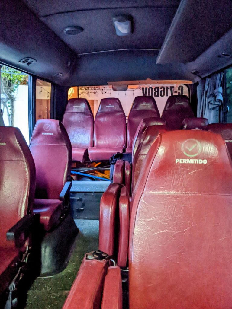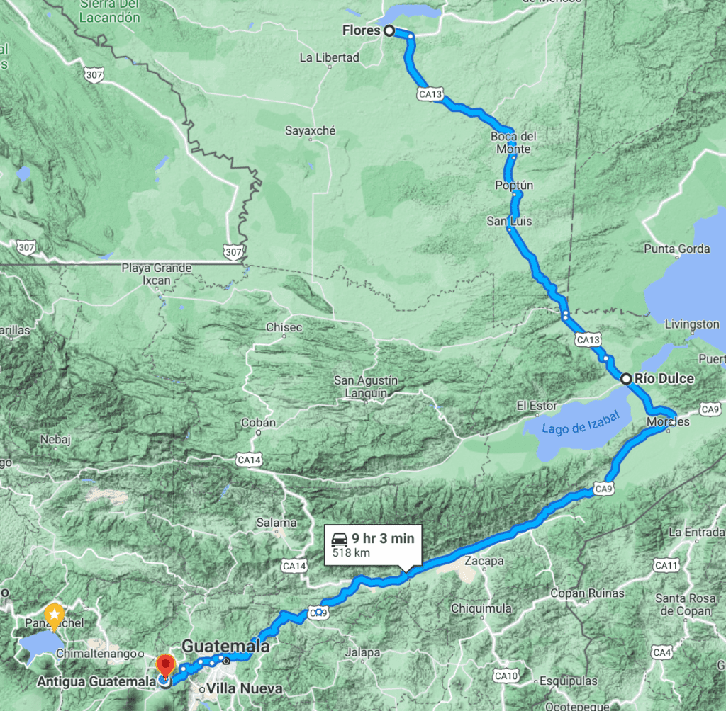 We were initially scheduled to leave Flores, Guatemala on September 27 at 8 am on a direct “collectivo” bus to Antigua Guatemala at 8 am. Tickets cost 400 quetzales/$50.92 per person, and we were supposed to arrive at 5:30 pm the same day.