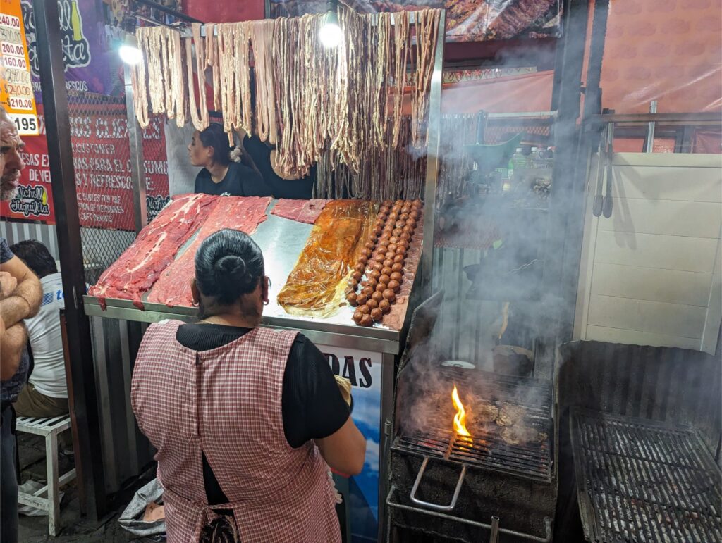 The Pasillo de Humo (Google Maps) is an enclosed alleyway east of Mercado 20 de Noviembre filled with stands cooking barbecue meats. It is easy to find – just walk towards Mercado 20 de Noviembre and follow the smoke!
