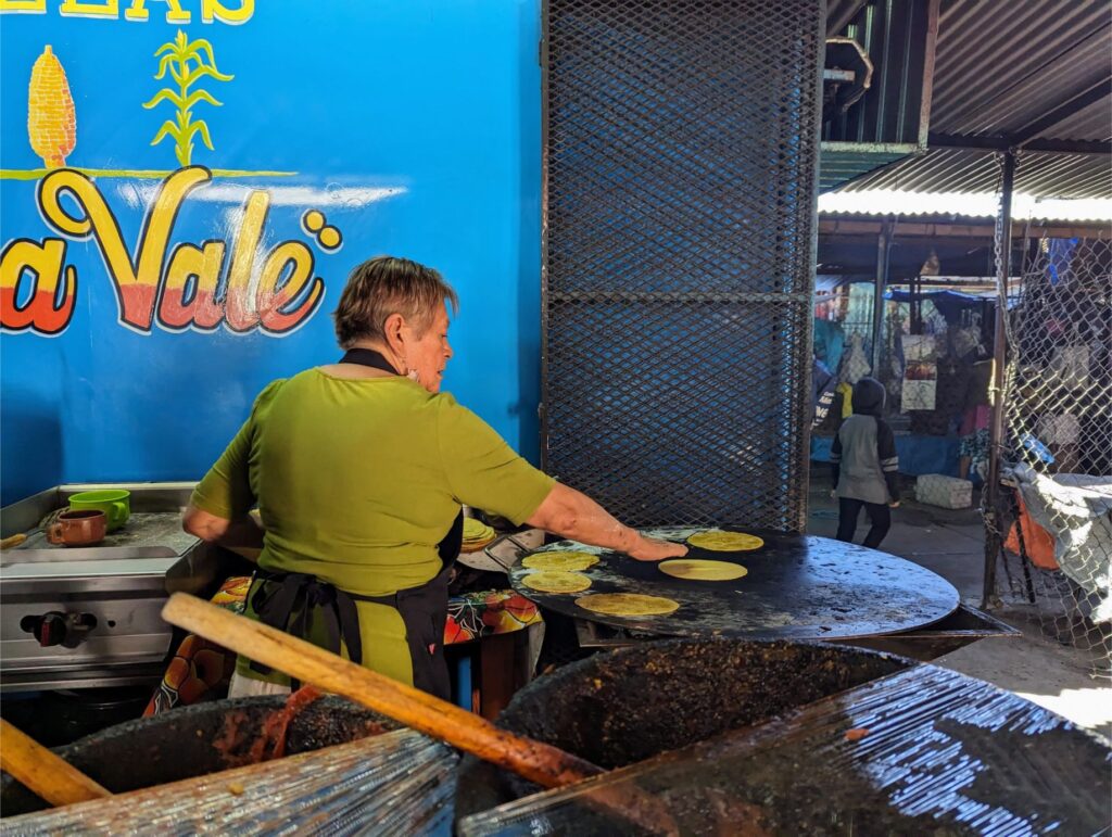 Buried in the nether regions of the Central de Abastos market, Memelas Doña Vale (Google Maps) serves the best memelas in Oaxaca. Her spicy salsa morita recipe is a closely guarded secret and has gained international attention. She even is featured in several Netflix TV specials on street cuisines of the world.