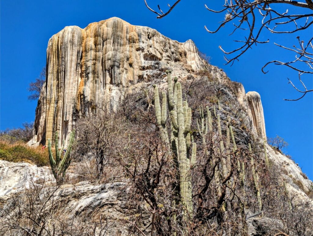 Known for its “petrified waterfalls”, Hierve el Agua (= “water boils”) is an eco-park with significant geologic activity. Mineral-laden water bubbles out of the ground and then flows off nearby cliffs, forming spectacular rock formations as minerals deposit over time.